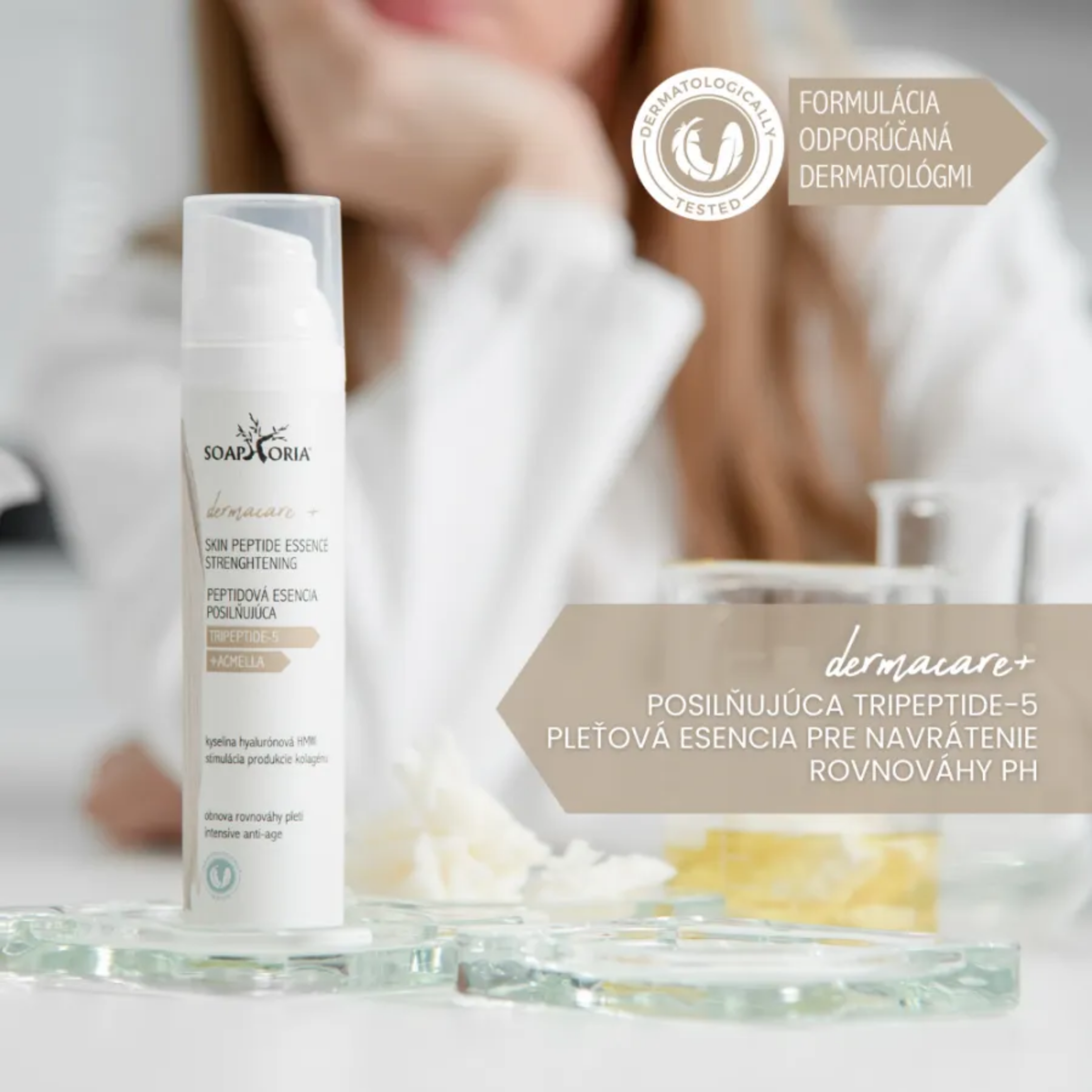 Soaphoria DERMACARE+ Hydratačná peptidová pleťová esencia s Tripeptide-5 a kyselinou hyalurónovou. Obnovuje pH, posilňuje bariéru pleti a redukuje známky starnutia.